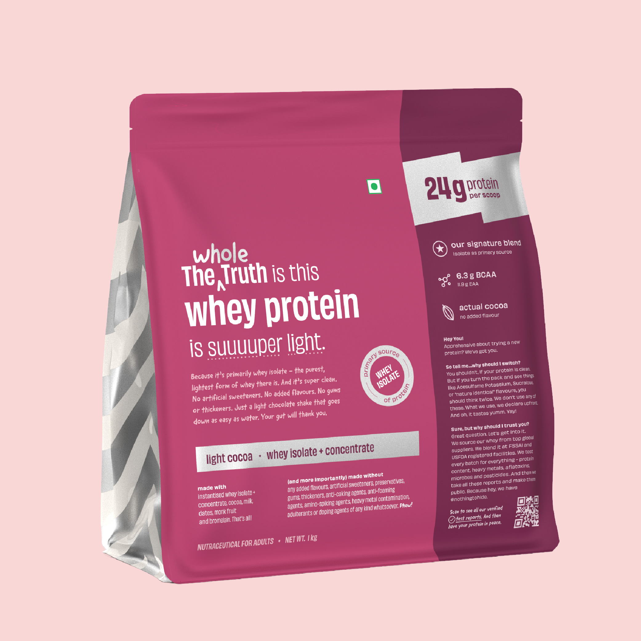 The Whole Truth Whey Protein is positioned as a minimalist whey protein supplement marketed for its transparency and third-party testing. Per typical serving (~25g), it delivers 22–24g protein with <1g sugar and 0.
